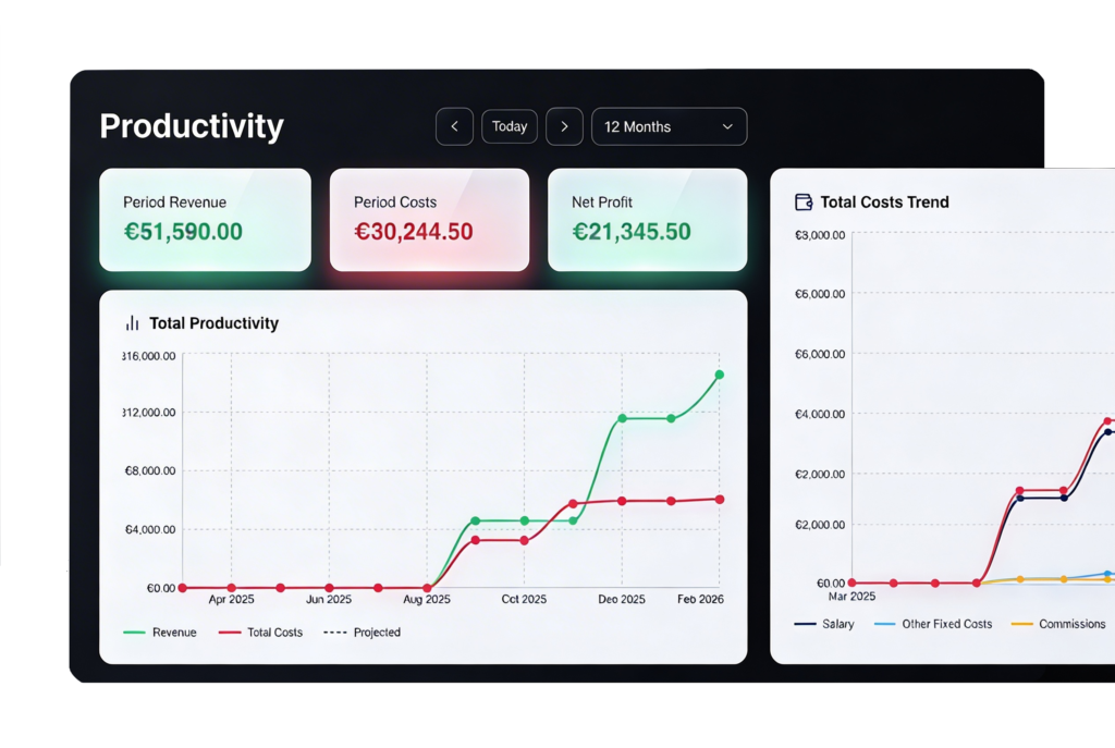 Die All-in-One-Plattform für modernes Provisionsmanagement. Behalte den Überblick über monatliche Mitarbeiterkosten, Mitarbeiterumsatz, Retainer und projektbasierte Provisionen – einfach und transparent.